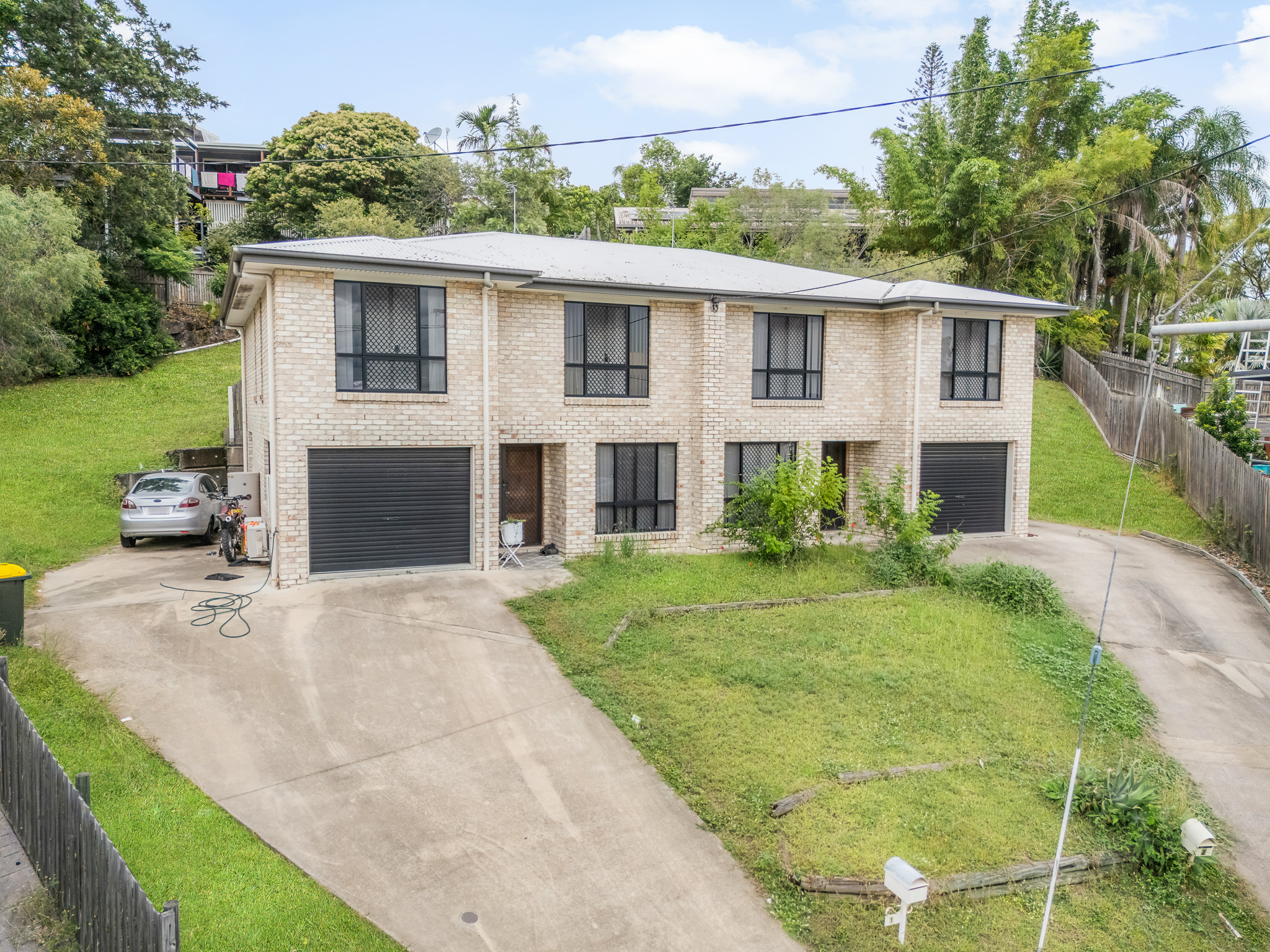 Practicality meets lifestyle in this low-maintenance package. Both kitchens are equipped with ample bench space and electric cooking, flowing effortlessly into the tiled dining and living areas. Security screens, private outdoor spaces, and single lock-up garages for each side add to the appeal, while the elevated position captures cooling breezes and leafy views.
